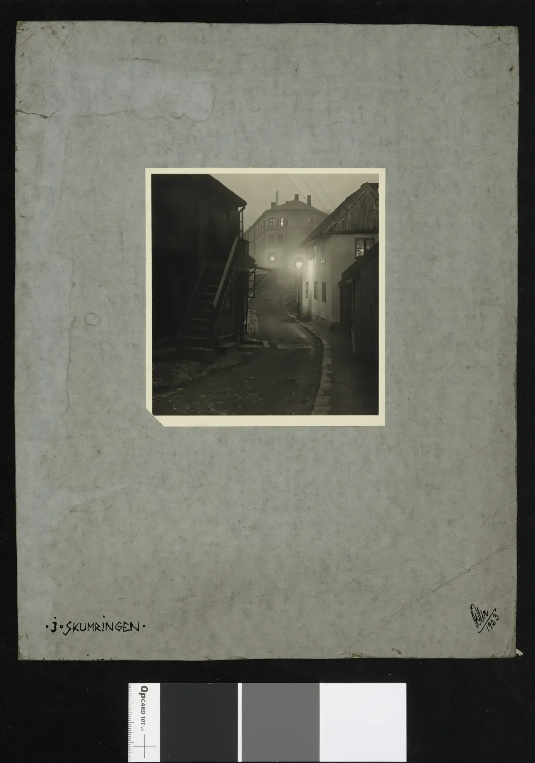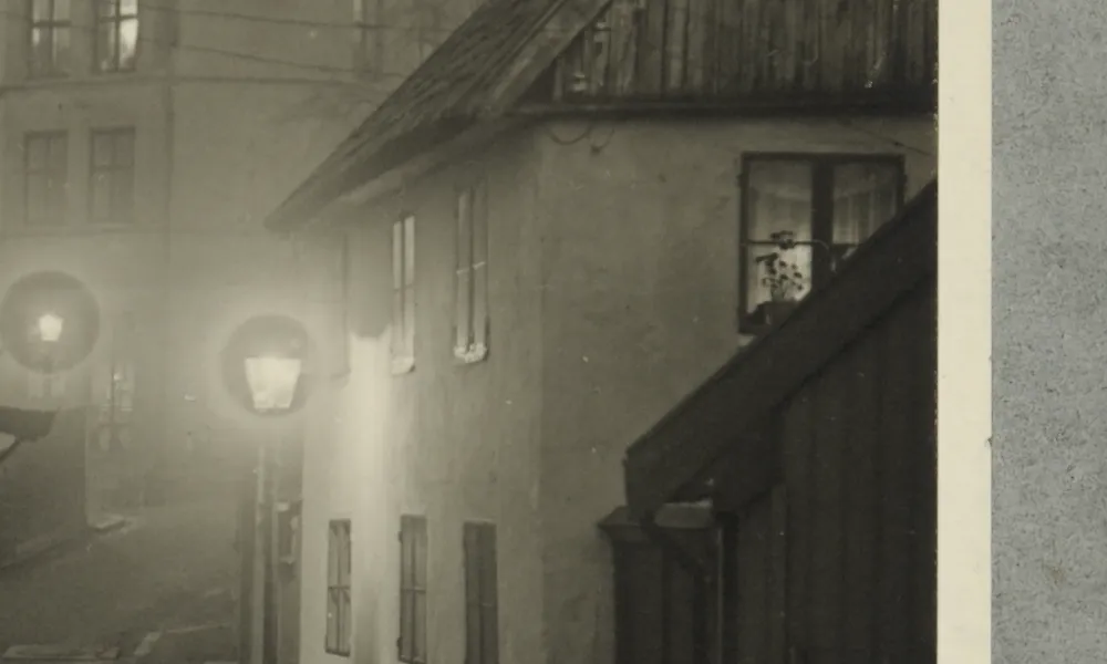 This early work by Olaf Christoffersen, “At Dusk,” depicts the quiet drama of a deserted backstreet in Oslo as evening’s darkness slowly encroaches. The image, from before Christoffersen’s shift to a modernist aesthetic, is bathed in a melancholic ambiance. The faint sources of light from the street lamps pierce through the mist, creating a sense of anticipation. These early evening hours, captured by Christoffersen’s lens, convey a stillness and isolation, while the fading lights invite contemplation.