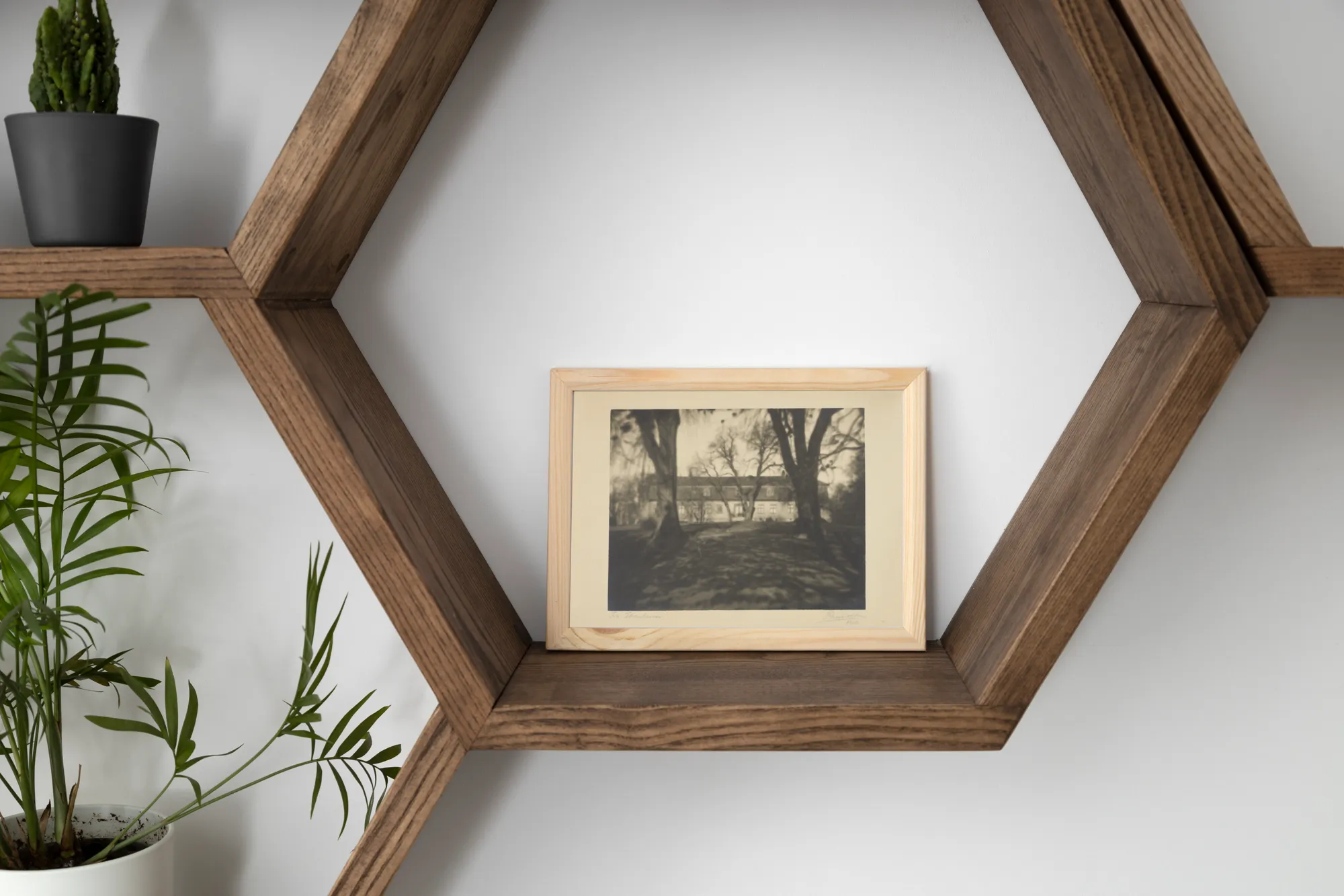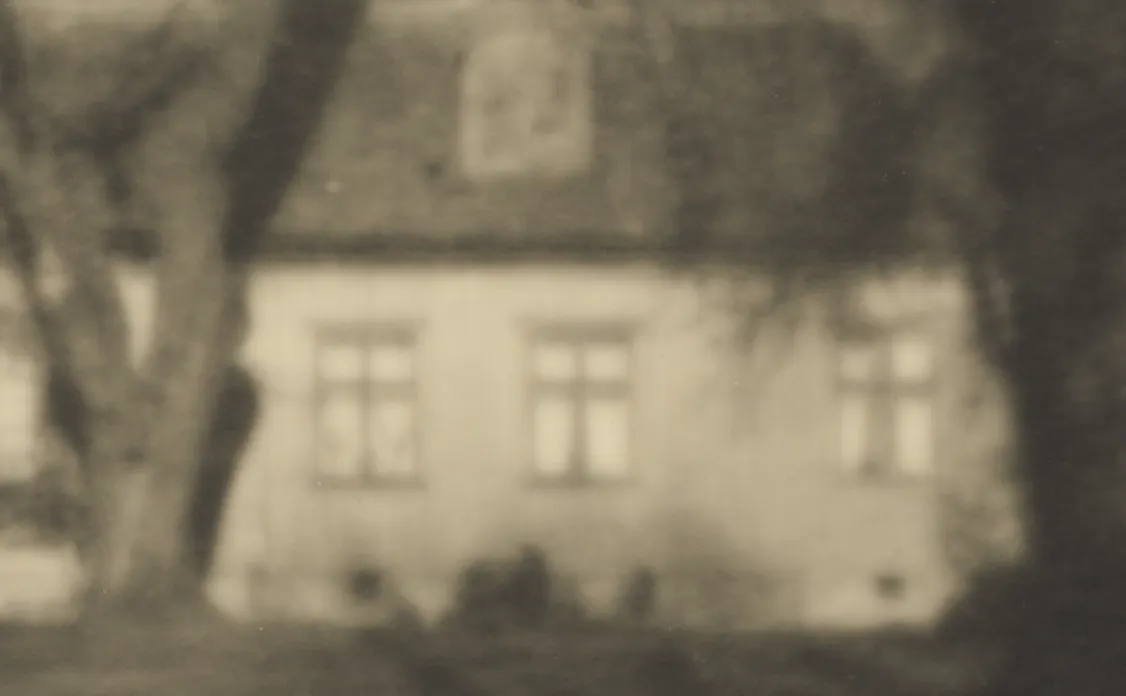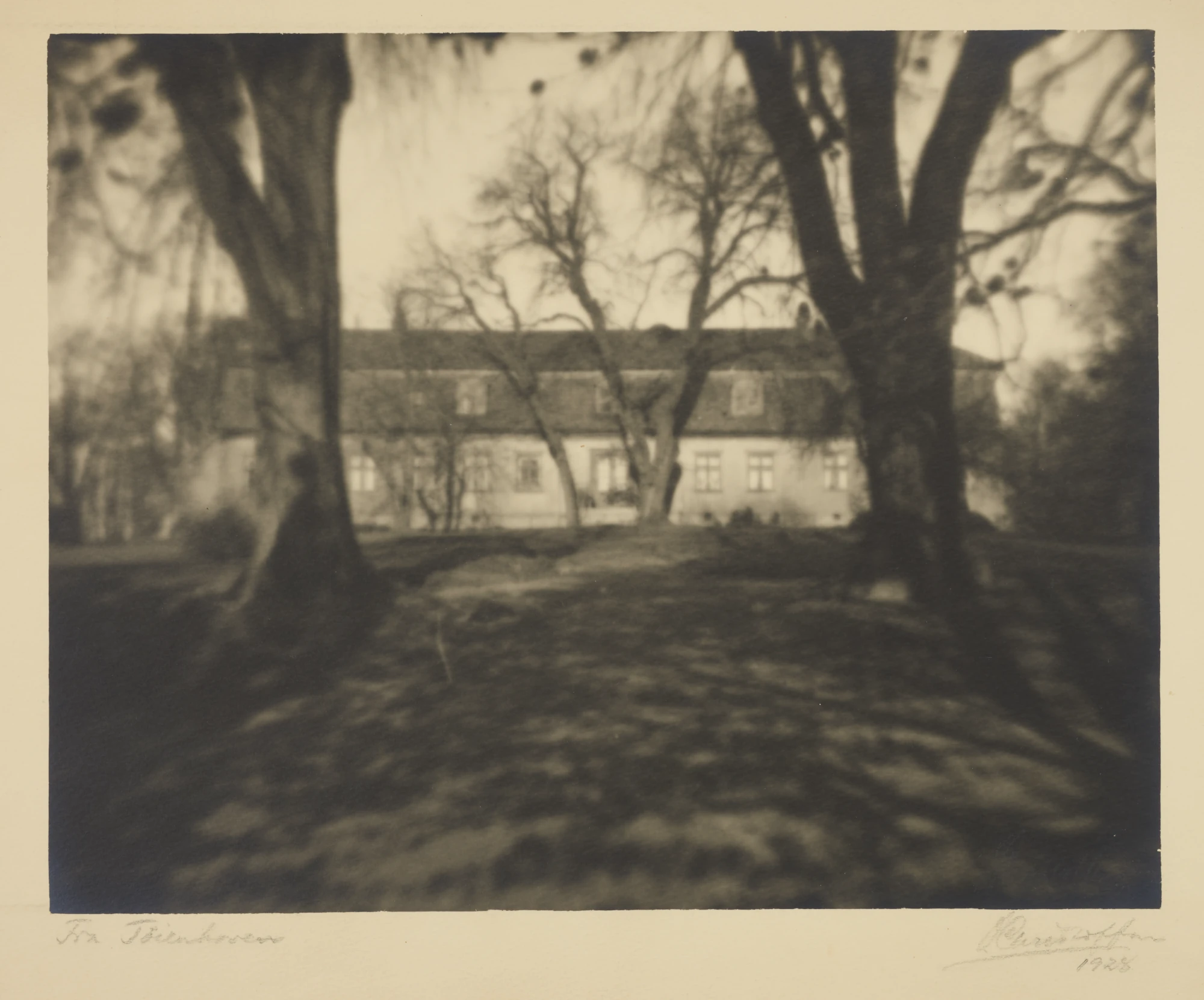 The image shows Tøyen Hovedgård in Oslo, viewed through a pictorialist lens. The same trees still stand around the manor, their growth reflecting the passage of time. The photograph provides a glimpse into a period before Tøyen Garden became the Botanical Garden, with a more romantic and soft atmosphere.