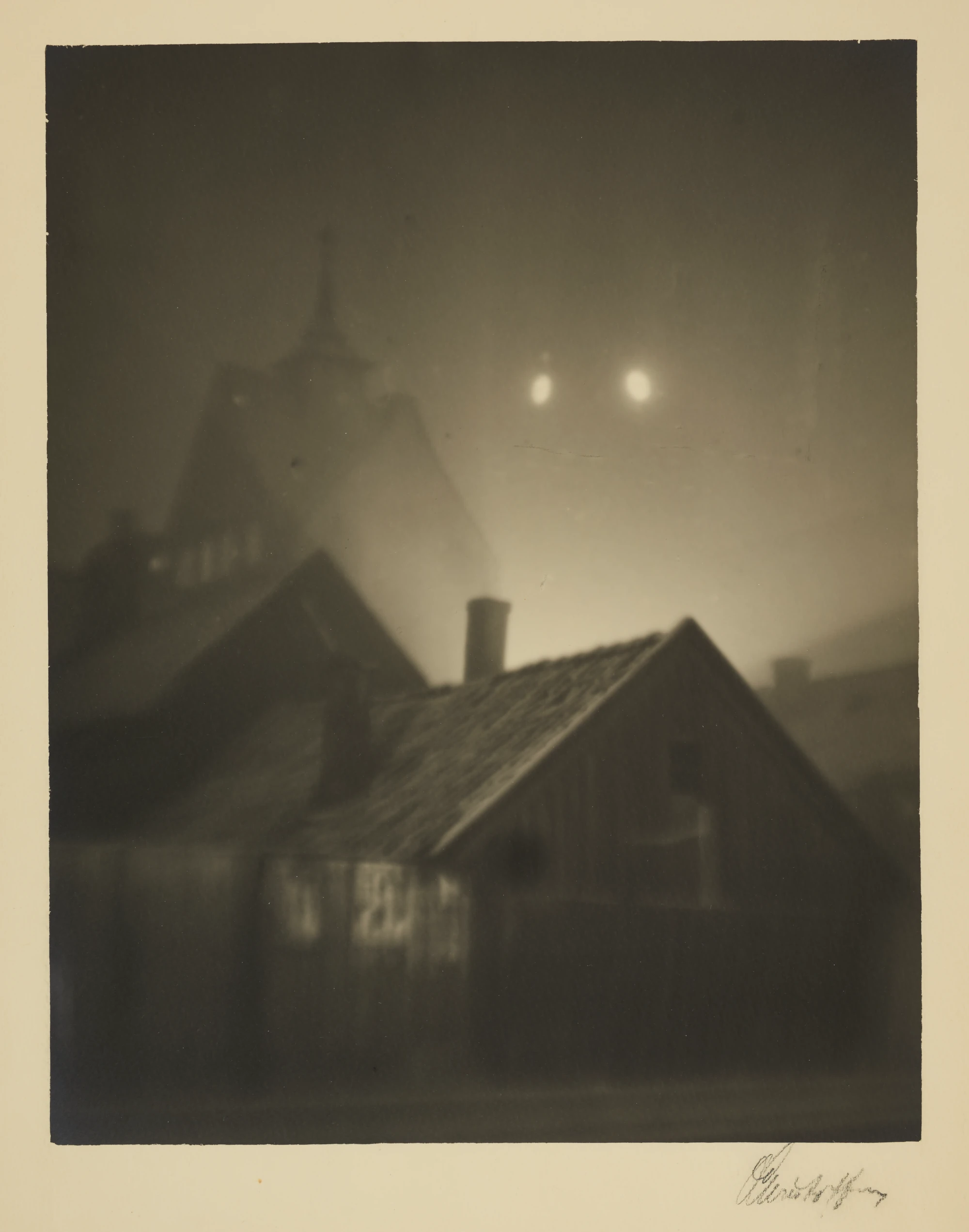Technical Details: The soft focus and murky atmosphere reflect a popular technique among photographers in the 1920s to imitate painterly qualities. The effect was likely achieved through a combination of long exposure, lens diffusion, and darkroom manipulation such as dodging and controlled underexposure. Despite its atmospheric tone, the image retains structural clarity—underscoring Christoffersen’s ability to balance emotion and form within a single frame.